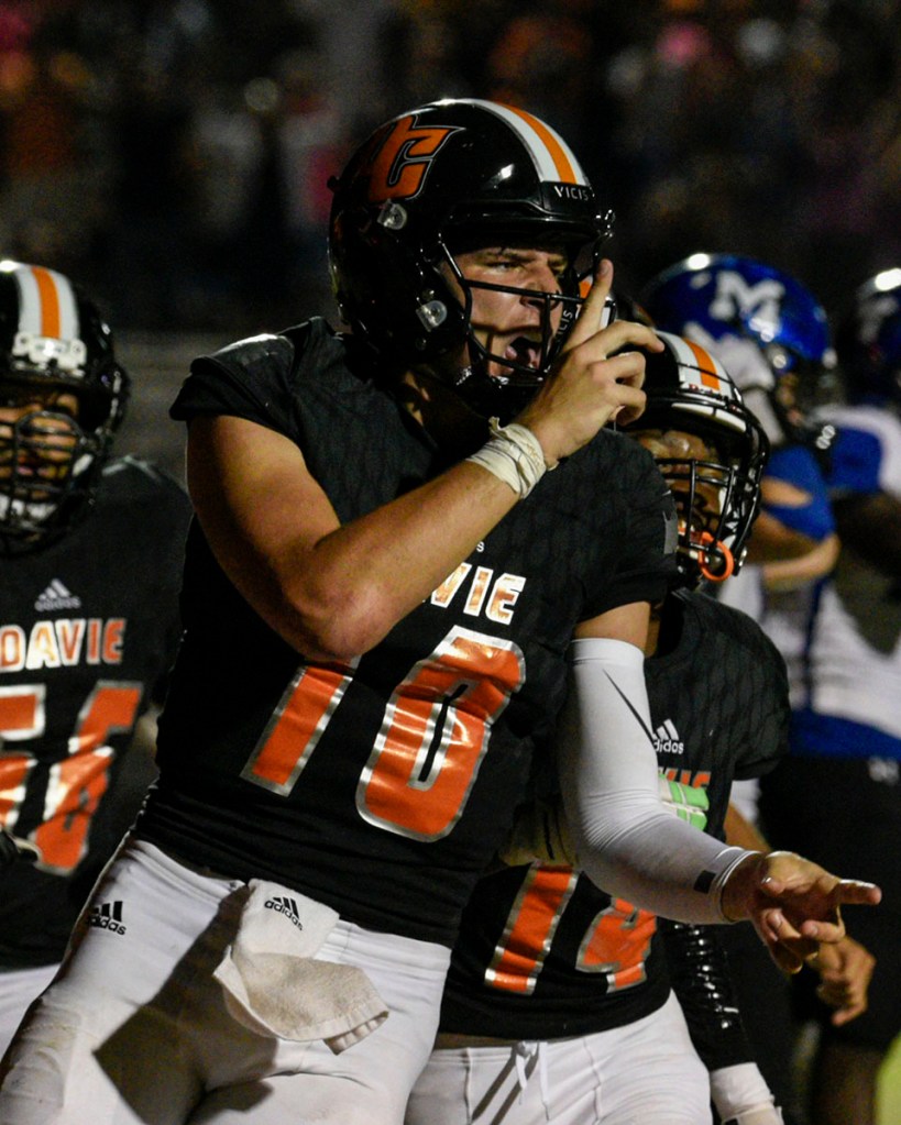 Tabitha Tesh (left) hugs her husband Alex, coach at North Davidson High School, after winning the first round of the NCHSAA playoffs against Oak Grove at Oak Grove High School in Winston-Salem, NC on November 15, 2019. North Davidson beat Oak Grove 47-17. (photo by Janis M. Grainger)