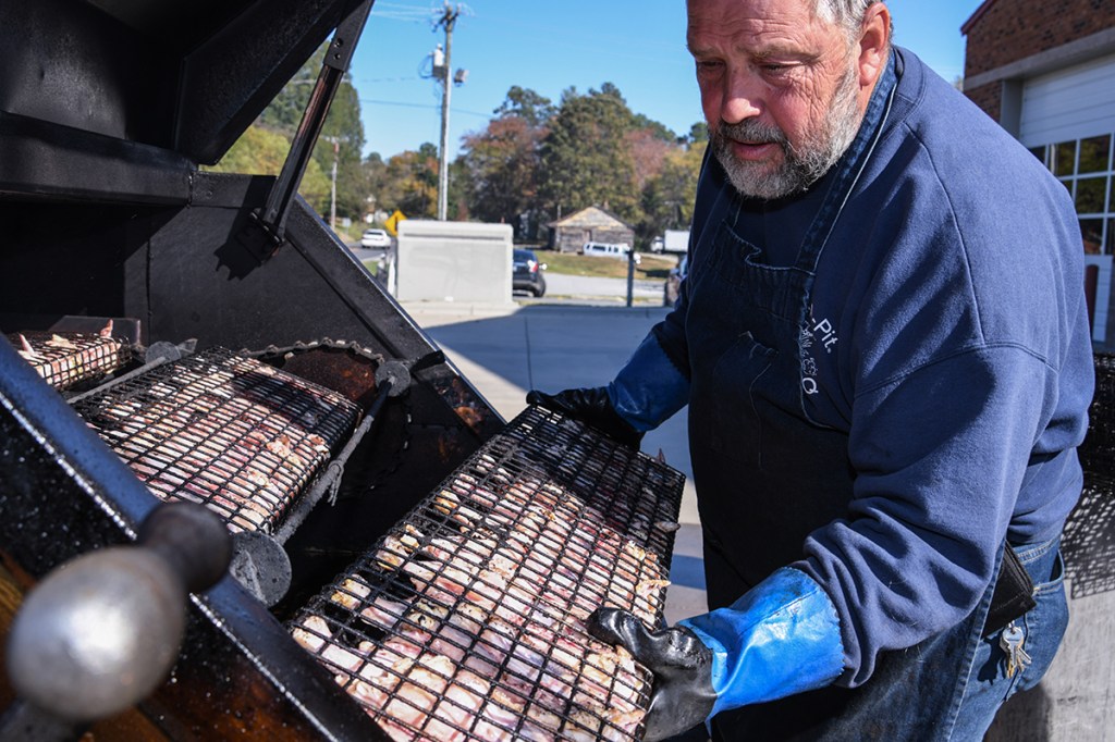 Michael Ervin places chicken in a wood smoker at the Gumtree Fire & Rescue in Winston-Salem, NC on November 9, 2019. Michael Ervin cooked 700 chicken halves for the Port-A-Pit Chicken Fundraiser to support the fire department. (photo by Janis M. Grainger)